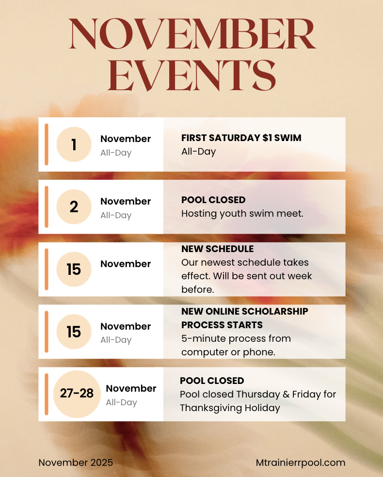 NOVEMBER SAVE THE DATE: Click here to view or view schedule below for November Important Dates including swim lesson registration dates, schedule changes, Thanksgiving closing, and our new online scholarship process.